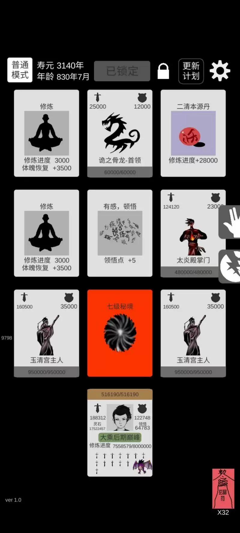 大乘以后要多打怪,攒灵石了,后面有几道坎,需要买顶级符把怪秒了。三次广告尽量留着最后应对必死局,比如3个玉清宫主人,只能拿神通打半血后拿符打死。