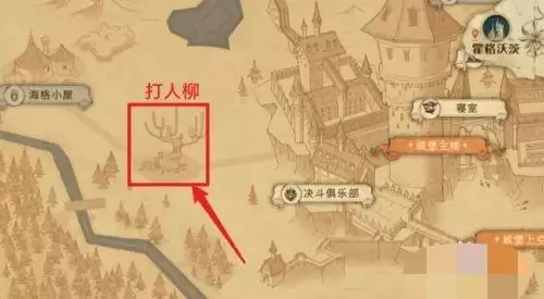 打开哈利波特魔法觉醒地图,即可查看打人柳在海格小屋和城堡的中间。
