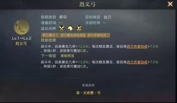 那么我们的最佳选择就是烈义弓了,除了战斗中能够提升装配武将暴击外,还能在触发暴击后给到物理伤害加成。