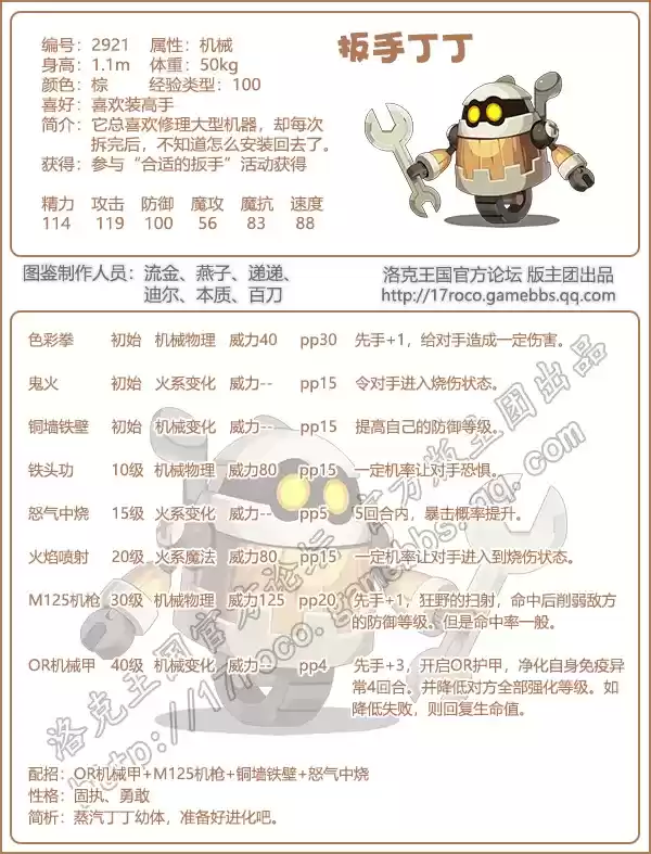 技能配招推荐:OR机械甲+ M125机枪+铜墙铁壁+怒气中烧。性格推荐:固执、勇敢。扳手叮叮是蒸汽叮叮的幼体,两者强度都不高,准备好进化吧,估计后面会进化的厉害的!