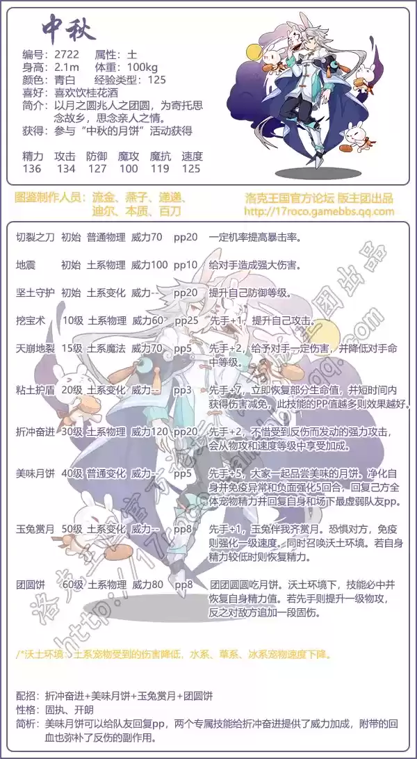 洛克王国中秋是9月17日更新后即将上线的宠物,技能配招推荐:折冲奋进+美味月饼+玉兔赏月+团圆饼。性格推荐:固执、开朗。美味月饼可以给队友回复pp,两个专属技能给折冲奋进提供了威力加成,附带的回血也弥补了反伤的副作用。
