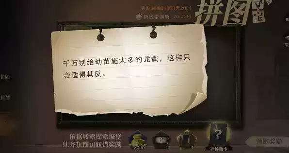 千万别给幼苗施太多的龙粪这样只会适得其反 哈利波特魔法觉醒龙粪肥用作什么[视频][多图],哈利波特魔法觉醒拼图寻宝9 22线索在哪里呢?今天我们遇到的问题是千万别给幼苗施太多的龙粪这样只会适得其反相关线索,话不多说,接下来我们第二期的拼图寻宝活动任务