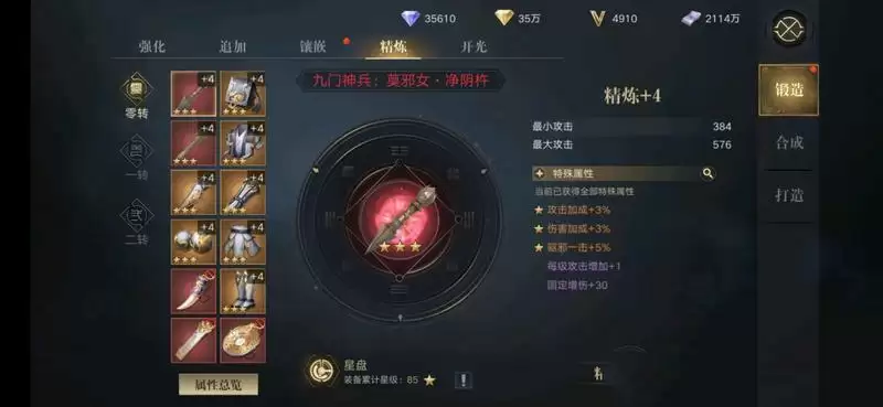 装备系统非常庞大,也是最重要的战力支柱,你能打多少输出,主要靠装备来支撑,所以金钻不要乱花,把他们投入到装备永远是最正确得选择,先来说一下精炼,0转装备最高精炼到4级,1转装备最高6级,2转最高目前不明,要么8级要么10级,等精炼上限回来补贴,每次精炼会解锁不同的装备词条属性,攻击装备主要是驱邪,伤害加成,技能加成等属性,而防御装备主要是驱邪抵抗,技能减免等对位属性抗性。