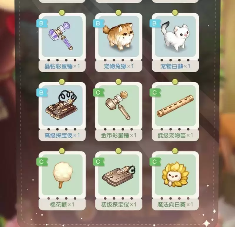 建议:优先考虑服装、晶钻彩蛋锤、高级探宝仪器,晶钻锤和高级探宝仪可以尽量多带。奖励多的情况下c级奖励可以不用带。(如果有s级或以上的奖励当然必选啦)