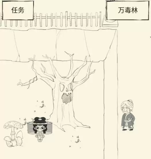 需要小伙伴们去摘蘑菇,蘑菇在你刚进入苗疆往左边处有一条小路,沿着小路一直走,就会看到一片蘑菇和一颗丑树,我们需要根据任务提示点击蘑菇或者树上的树叶,如果你点击蘑菇或者树上的树叶没有反应,可以多点几次;