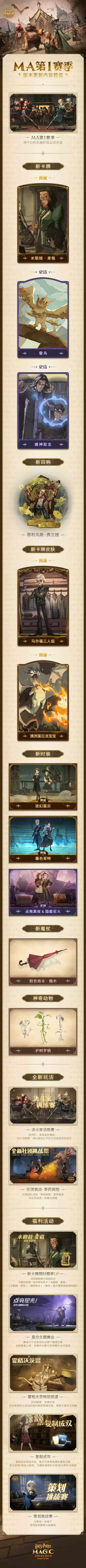《哈利波特:魔法觉醒》MA第1赛季将于10月1日正式更新,更新之后将会加入全新的卡牌、回响以及玩法等,当然还有限定的时装可以让腻收集获得,那么具体的内容我们可以通过以下长图进行了解。