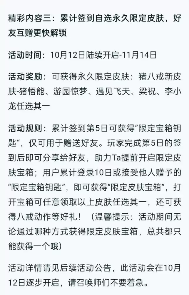 除了一贯的周年返场投票之外,还有一个签到送限定皮肤的活动。这次活动的内容非常简单,大家只要连续登录就能够任意选择一款文创主题的限定皮肤,包括了四个周年庆皮肤和猪八戒的皮肤。这个活动大家只要看自己缺少哪个就选哪个,如果缺少两个可以当做花50买了两个限定皮肤。