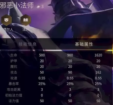 技能效果:邪恶小法师用魔法能量来轰击随机一名敌人,造成350/650/1350点魔法伤害。如果邪恶小法师的星级高于敌人,那么这个技能会将其立刻击败。