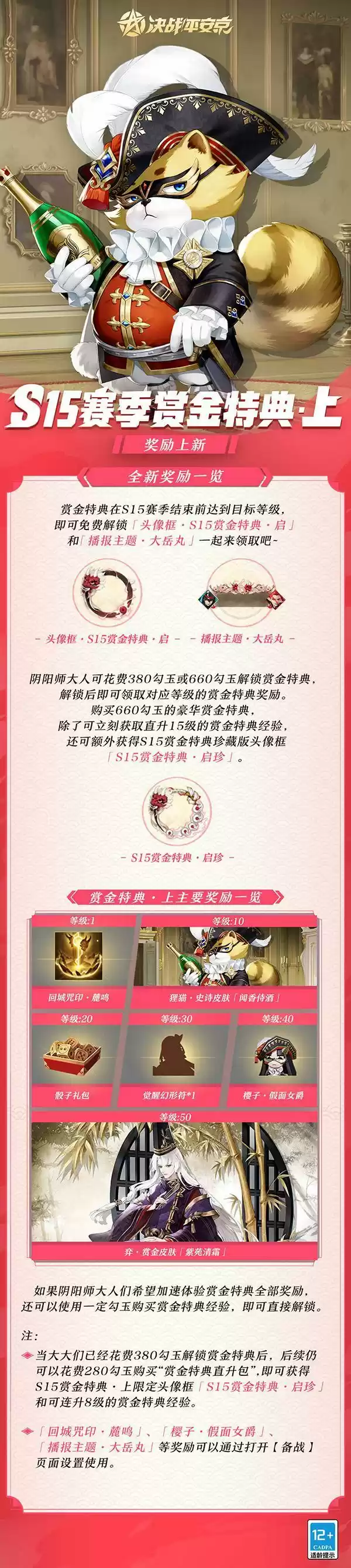 1、当大大们已经花费380勾玉解锁赏金特典后,后续仍可以花费280勾玉购买“赏金特典直升包”,即可获得S15赏金特典·上限定头像框「S15赏金特典·启珍」和可连升8级的赏金特典经验。