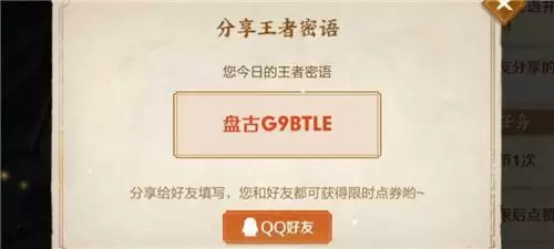 然后会获得自己今日的王者密语,将其分享给好友。(PS:联系一名好友,让其进游戏以同样的方式,将他的密语分享到我们的QQ/微信。)