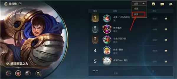 2、点击排行榜页面的任意一位英雄,并选择左上角的全服,切换为战区;