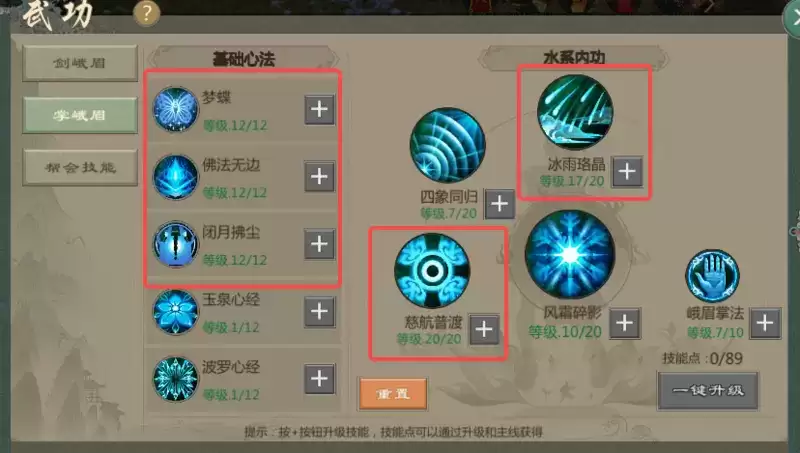 人物升级获得的潜能点,全部加内功,前文提到,峨眉定位是外功远程输出辅助,主要负责团队中队友的血量保证队友的持续输出能力,考虑其辅助功能的最大化,内功和内功攻击相辅相成,因此全加内功,这种极限加点,会极大的提升技能辅助的最大化和对敌人持续的缓速和受伤效果。