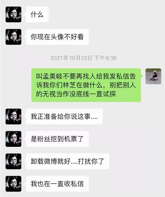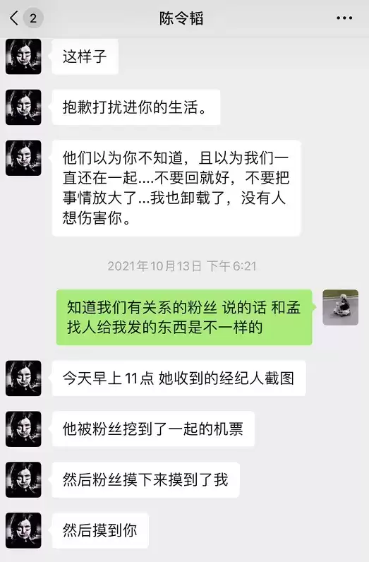 从大花妞今年10月13日和陈令韬的聊天里能看出,这些天来孟美岐的粉丝以及受到孟美岐指使的人一直在给大花妞发骚扰私信。