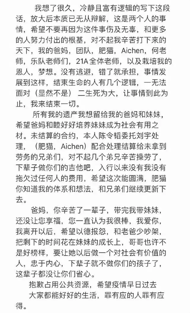 在大花妞彻底爆料实锤后,陈令韬承认了自己出轨的事实,还写了一封类似于遗书的声明。
