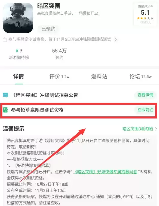 1、前往快爆暗区突围游戏详情页,参与资格招募填写问卷,招募有效时间:即日起- 2021年10月27日下午6点。