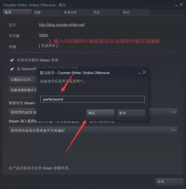第三步,在弹出的【启动选项】对话框中的输入框中,输入【-perfectworld】点击【确定】即可。如果想回到CSGO国际服那就在这个输入框中,写入【-worldwide】就可以了。