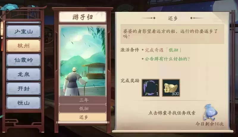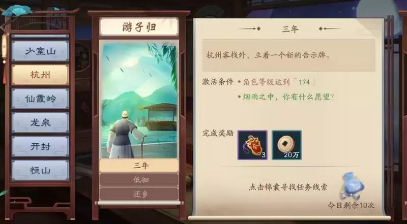 角色等级需要达到174级。去杭州杭州城下方(733,590)处点击祈愿,祈愿3~5次即可触发条件。根据任务引导做完后续任务可得3金帛令和20万铜币。
