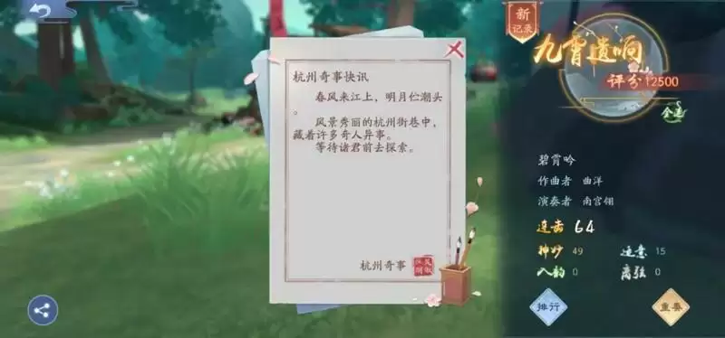 角色等级需要达到化境11。弹奏曲洋的曲谱碧霄吟(注意需要全连)触发后续任务。跟随任务引导做完后续任务就可以了。获得3个檀香以及20万铜币。
