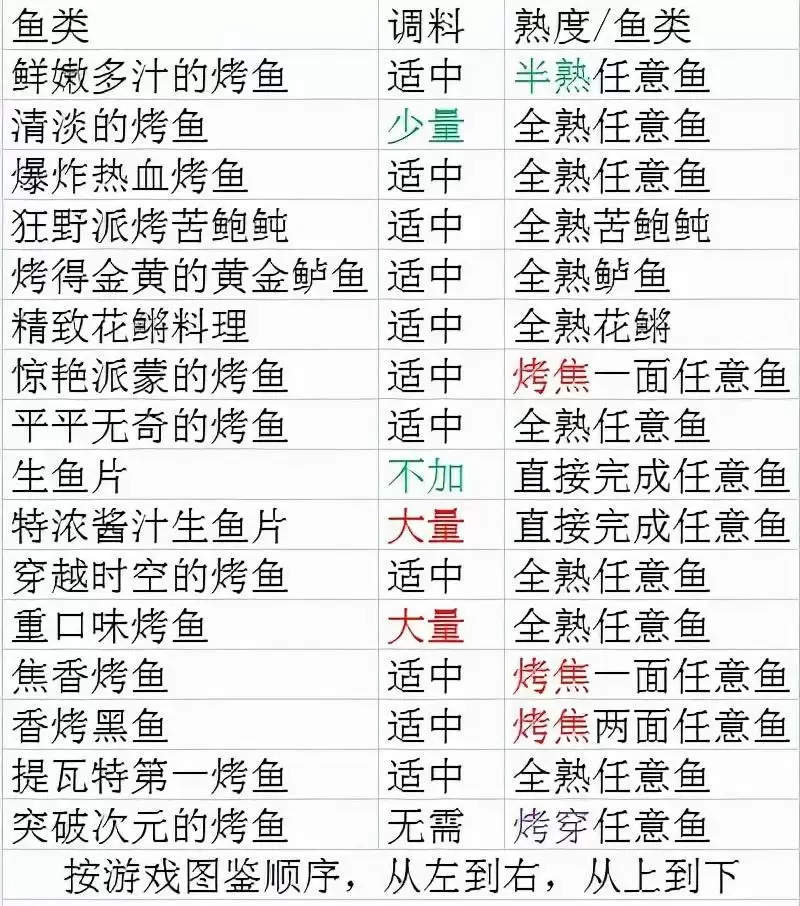 烤焦一面任意鱼(不翻面就行)=焦香烤鱼/惊艳派蒙烤鱼(刚刚冒烟立刻点完成)