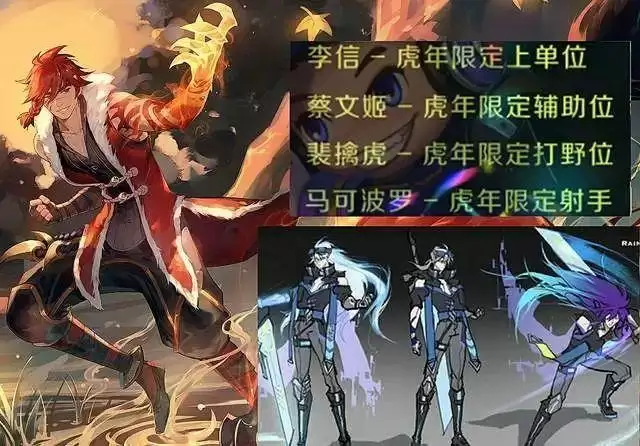 除了中单和打野,剩下三款虎年限定皮肤会给到上单,射手以及辅助。李信成了上单虎年限定皮肤的热门之选,辅助的虎年限定皮肤可能会给到蔡文姬,射手的年限皮肤或许会给到马可波罗。