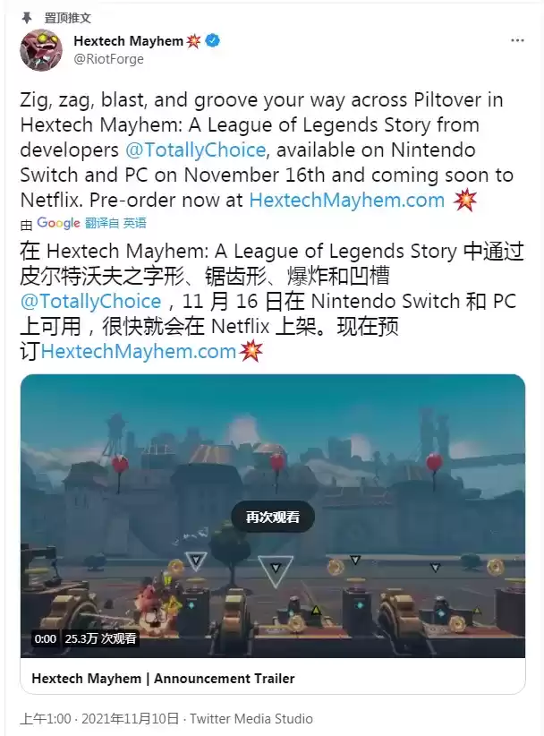 我们都知道,拳头公司(Riot Games)目前曝光了几款《英雄联盟》IP游戏。但实际上,“英雄联盟宇宙”远不止于此,拳头公司其实还有一个“Riot Forge计划”,Riot Forge 将会发行由外部工作室制作“英雄联盟”背景故事的游戏。Play Video这不,11月10日,Riot Forge宣布了将推出一款“英雄联盟跑酷”游戏《Hextech Mayhem: A League of Legends Story》,该作将于11月16日登陆Nintendo Switch 和 PC,并在之后登陆手游。