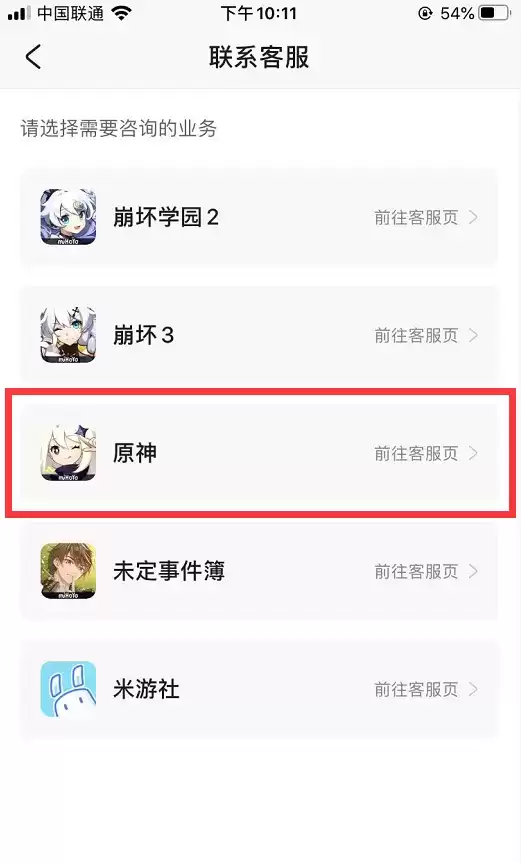 第三步:点击“联系客服”,会出现如下图所示界面,选择“原神”