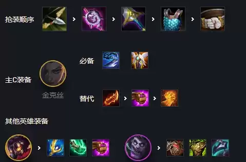 主C金克丝:装备给上羊刀,巨杀,复活甲备选法爆,正义