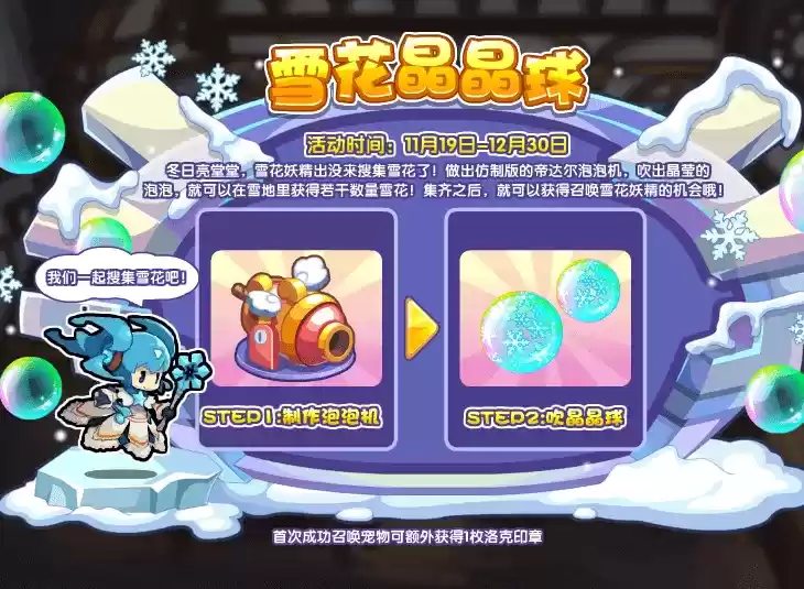 准备工作完成后则再前往源码冰岛吹泡泡,单次需要消耗:肥皂x2、纯净水x10,泡泡凝结成霜就可以收集雪花,累计收获24个就能领取宠物:雪花精灵。