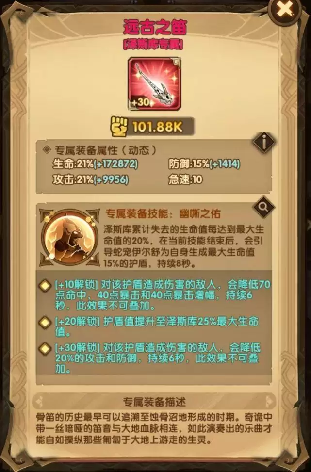 泽斯库吹奏骨笛,对所有敌人造成300%攻击力的伤害。如果敌人感染的舌吻层数超过3层,则会进入石化状态,无法行动和获得能量,持续5秒。石化状态结束后,敌人将降低40点急速,持续5秒。