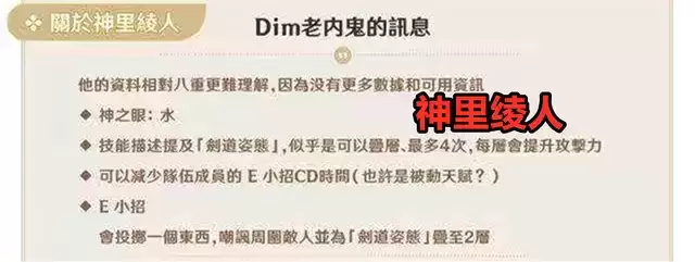 据早期爆料,神里绫人是一名水系的大剑角色。而在近期这次爆料之中,神里绫人的武器是单手剑,可叠加层数提升攻击力,还能减少队友元素战技的CD。神里绫人的元素战绩为扔出一个嘲讽物……喂,这真的不是甘雨和莫娜的元素战技吗?