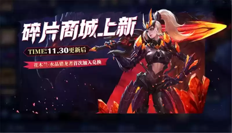 碎片商店不是进行了更新,花木兰的水晶猎龙者首次加入兑换,很多玩家都使用88个皮肤碎片进行了兑换,这款史诗皮肤的手感可以说是非常的不错,小编对于花木兰这款皮肤也是非常的喜欢,不过小编建议大家兑换自己喜欢的英雄皮肤,因为小编觉得很多玩家不太会使用花木兰,这个英雄有一定的操作难度,虽然是第一次加入碎片商店,但后续肯定会持续加入的。