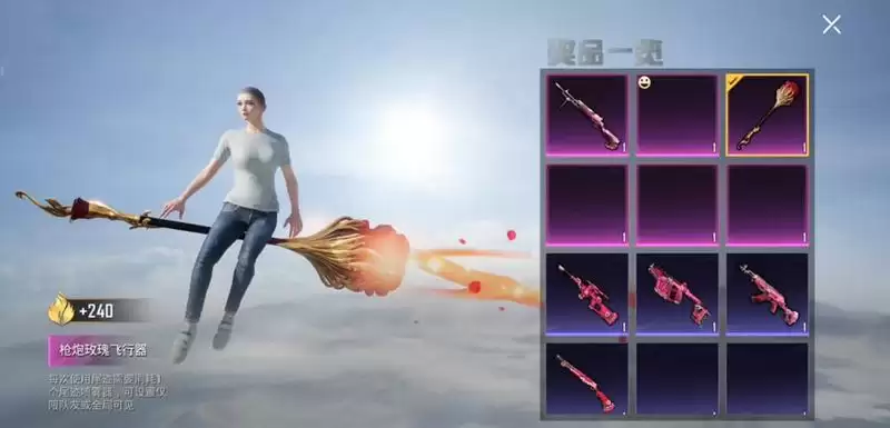 最后就是飞行器的皮肤了,这个飞行器给人感觉还是挺亮眼的,角色坐在一枝巨大的玫瑰上面,形式就和当场“魔法学院”的扫帚飞行器一样。