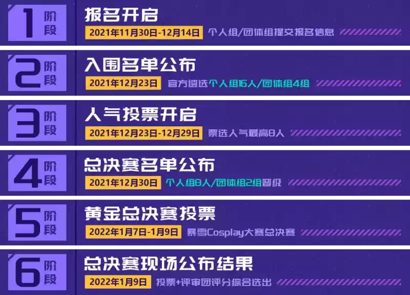 本届比赛共分为6个阶段,分别是报名阶段(2021年11月30日-12月14日)、入围名单评选(2021年12月15日-12月22日)、入围名单公布及投票(2021年12月23日-12月29日)、总决赛名单公布(2021年12月30日)、黄金总决赛Cosplay总决赛(2022年1月7日-1月9日)、总决赛结果公布(2022年1月9日)。