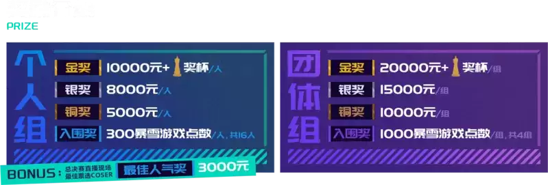 本次比赛为参赛者准备大量丰厚奖品,个人组和团体组的冠军将分别获得10000元和20000元的现金以及2021黄金总决赛小金人奖励。期待每一位热爱暴雪游戏的玩家带来高还原度的角色和精美的装备服饰,赶快报名参与吧!