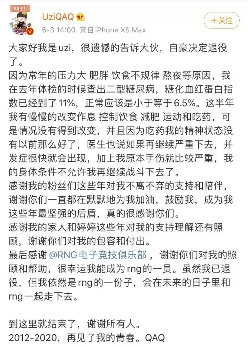 2020年6月3日,中国著名电竞选手Uzi(简自豪)在个人社交媒体宣布退役。Uzi当时表示,自己的身体状况已经不允许再继续比赛。