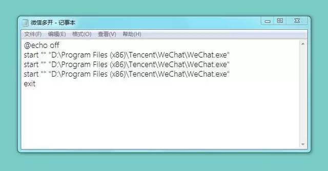 两行 start "" 后面的路径就是刚才复制的微信目标路径,双开就两行,多开就多复制几行放在exit上面即可,下图所示是三开。