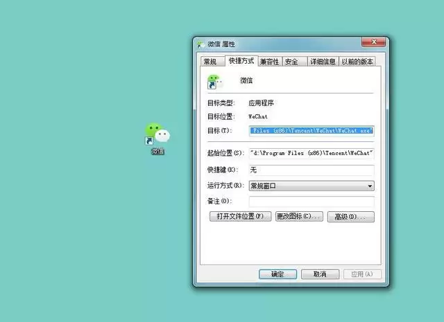 第一步,我们找到微信电脑版的快捷方式,右键属性,找到“目标”,复制目标地址(打开后目标地址已被选中),比如我电脑上的地址是"D:Program Files (x86)TencentWeChatWeChat.exe",注意,双引号要一块儿复制上。