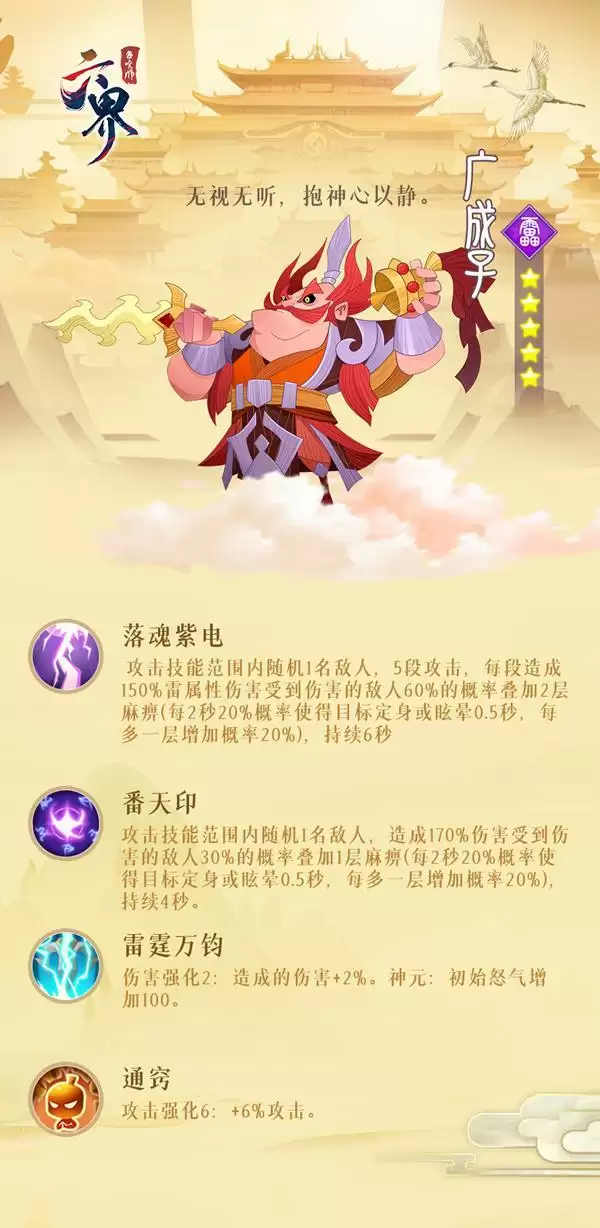 《六界召唤师》游戏中广成子是一位五星英雄角色,相信很多玩家都想要了解这个人物吧,那么今天小编就给大家介绍一下六界召唤师广成子技能,有需要的小伙伴不要错过了。