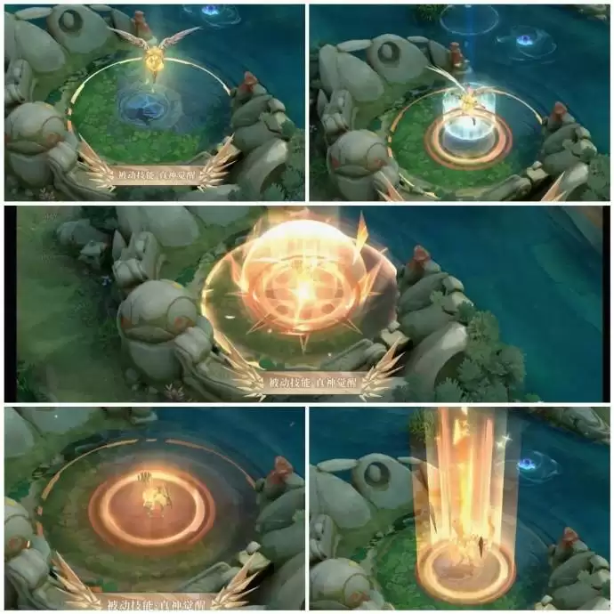 大招的特效更明显,先有一道光从天空照下,然后地上出现图案,雅典娜就立于其中。