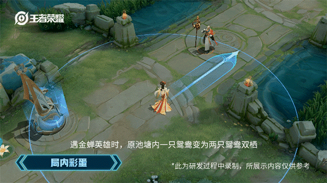 在局内,我们设计了女王遇到金蝉英雄时,其三技能范围中会有两只鸳鸯双栖的小彩蛋(无彩蛋触发时为一只鸳鸯)。呼应剧中女王和唐僧逛御花园时,戏指鸳鸯的场景,暗示女儿情追不可得