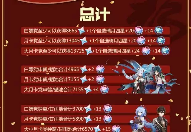 整个2.4版本下来,普通玩家可以获得8600原石+20个纠缠之缘+14个相遇之缘+一个璃月自选四星角色【大部分玩家都会选择云堇吧】,整个换算下来,普通玩家至少都能抽到一个五星,如果小保底不歪的话,魈、申鹤、钟离和甘雨就是四选一了。而小月卡玩家则可以多获得4400原石,大月卡玩家能多获得5100原石+4个纠缠之缘,因此大家现在可以计划起来了,根据原石数量选择当哪类玩家吧。