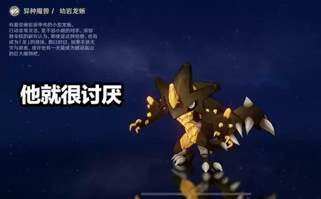 第二就是幼岩龙蜥,这应该是大部分萌新破防的存在,岩属性不能进行元素反应,只能结晶,所以你想要的蒸发和融化几乎是不可能出现在龙蜥的身上,于是就只能用基础伤害和他硬刚,但是幼岩龙蜥比成年的龙蜥灵活且多变,当他感觉不对劲的时候,就会化身成一个陀螺到处乱飞,基本上不能攻击到的,等他再次回来的时候,玩家才能继续攻击,每次要刷古岩龙蜥的时候我就在想,直接一击打中他的弱点让他翻滚不了就好了。