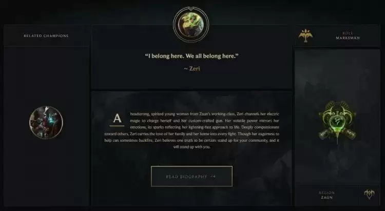 据英雄传记记载,Zeri来自祖安,是位倔强的年轻女性,会用电力魔法为自己以及自己的特制枪充能,定位为AD射手。