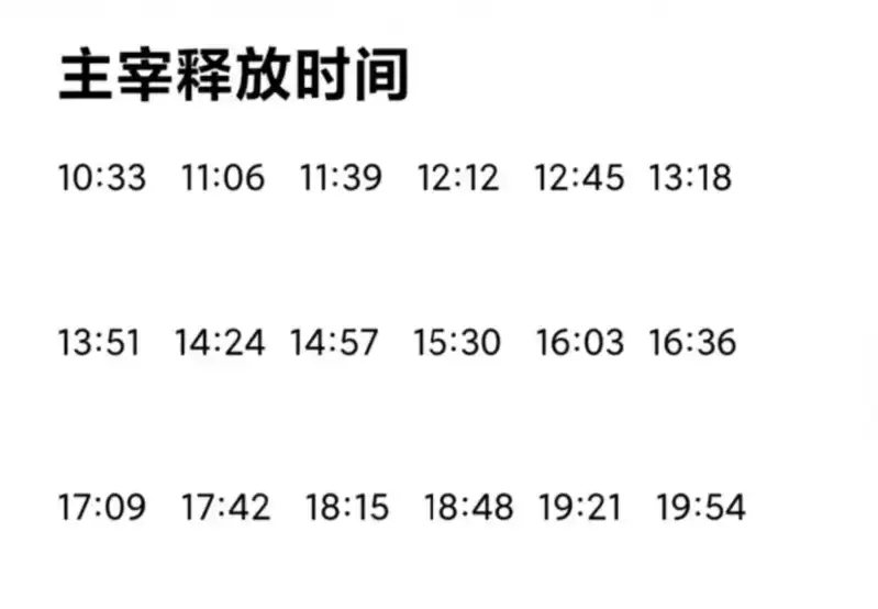 主宰释放时机的时间表是这个,我们直接抄up作业就行了,10.33 ,11.06 ,11.39 ,12.12 ,12.45 ,13.18,