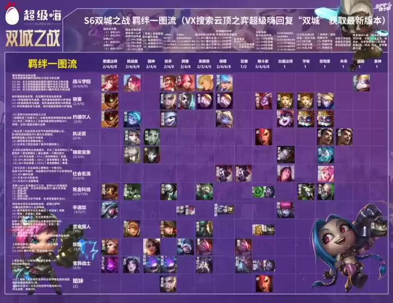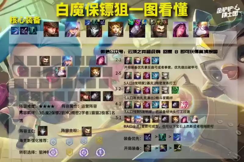 后期根据海克斯强化提升阵容,有保镖转直接凑出4保镖,有发条转开4发条,有狙神转给发条、杰斯、卡莎都是非常不错的选择。什么都没有就直接补塔姆吃人也是非常不错的选择。
