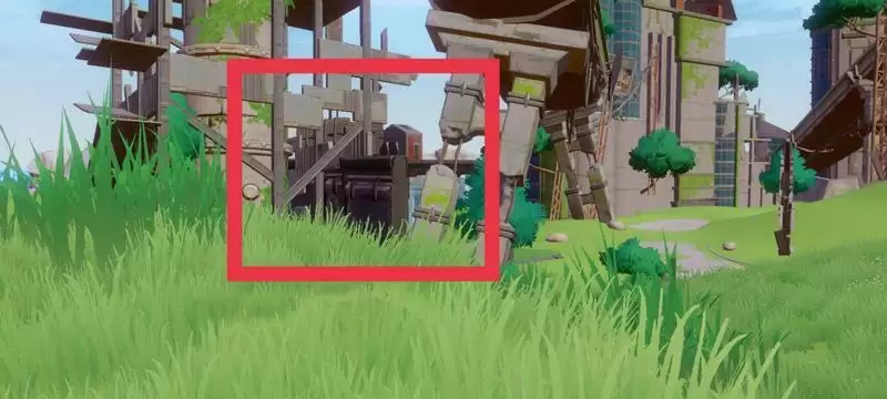 到了折跃门后看向折跃门左方朝着对面带着一根断掉的水管的一处废墟走,之后往那废墟右方的一块草地走。