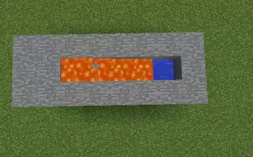 3、然后在水的上方倒入一同岩浆,岩浆遇到水会变成石头。岩浆不要碰到水的初始位置;