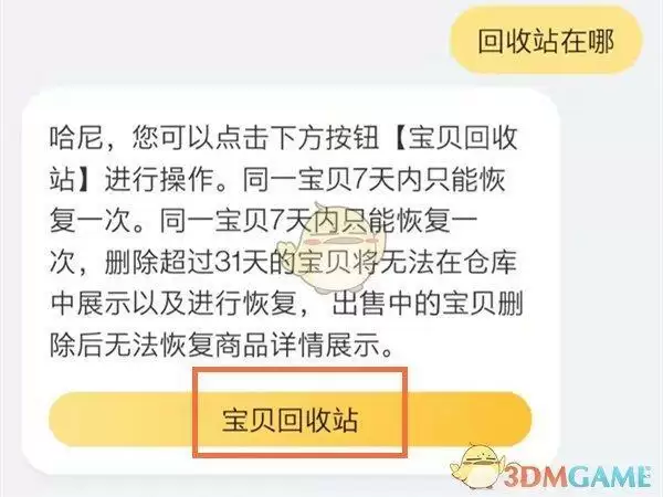 2、发送“回收站在哪”,然后进入客服回复的“宝贝回车站”入口即可找到。