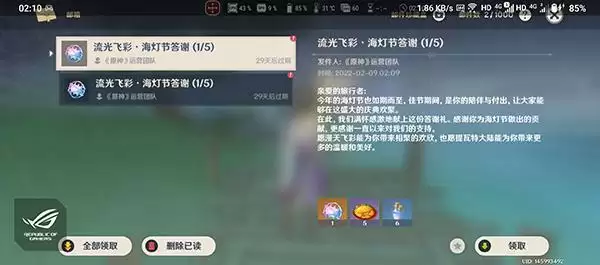 在2022/02/09 3:00起至2.4版本结束,旅行者均可收到总计两份“流光飞彩·海灯节答谢(1/5)”邮件。已收到的旅行者不会重复领取。我们不会对已发放奖励进行扣除。