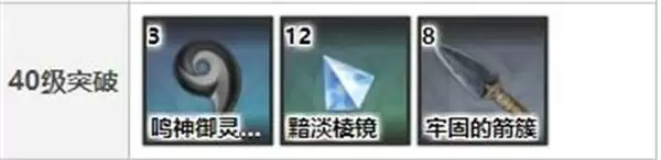 40级:鸣神御灵的欢喜*3、黯淡棱镜*12、牢固的箭簇*8、摩拉*1.5万